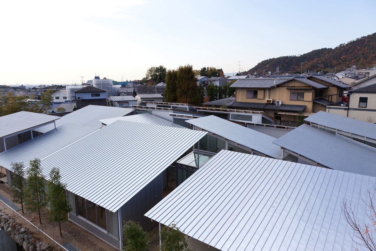 room的设计,会比周围的建筑大得多,所以考虑到和当地住宅规模相配合,我们设计了错落有致的屋顶。京都对此区域的建筑设计有一定限制,需要我们对屋顶的形状、色彩、素材的搭配配合街道进行一定考虑。在屋顶的设计上,10个单元我们就设计了10个屋顶,所以与其说是集合住宅,不如说是建了10栋住宅。因为每栋住宅独立的过于明显,进行各种讨论研究后,我们给每一家住户都设计了3个屋顶,自家的屋顶可以和邻居共用,这就是我们设想的,相互连接而成的集合住宅。屋顶以群体的形式聚集,形成一个大型的居住建筑。每栋住户即有所分离,又与其他住户的屋顶有所连接。