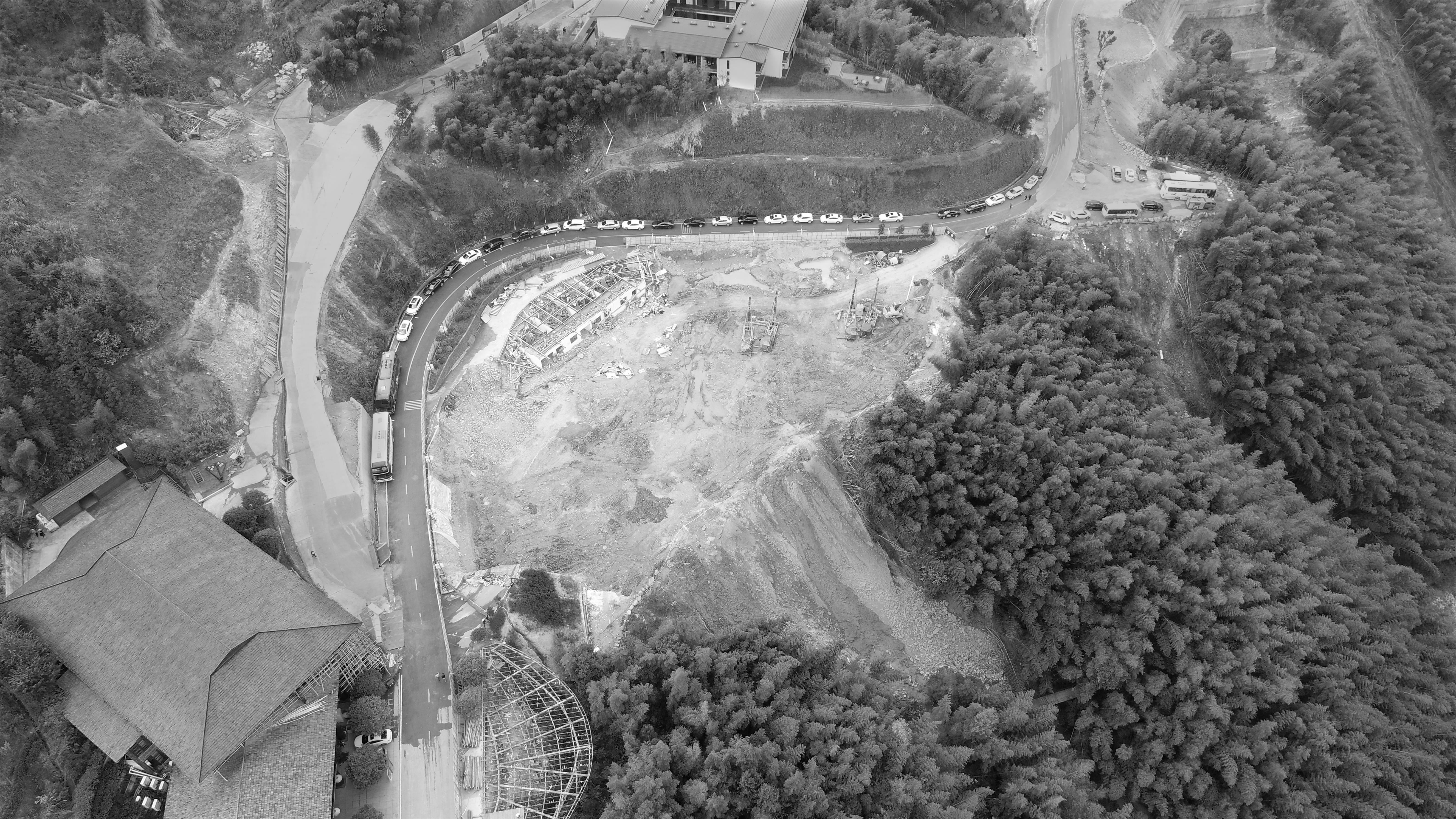 用地现状为一临时停车场,对于解决景区的停车问题有着举足轻重的作用,但由于周边都是自然山林,不太可能重新再开挖这么一大片停车场,那如何在保留现有停车功能需求的情况下置入展厅就显得尤为重要了。