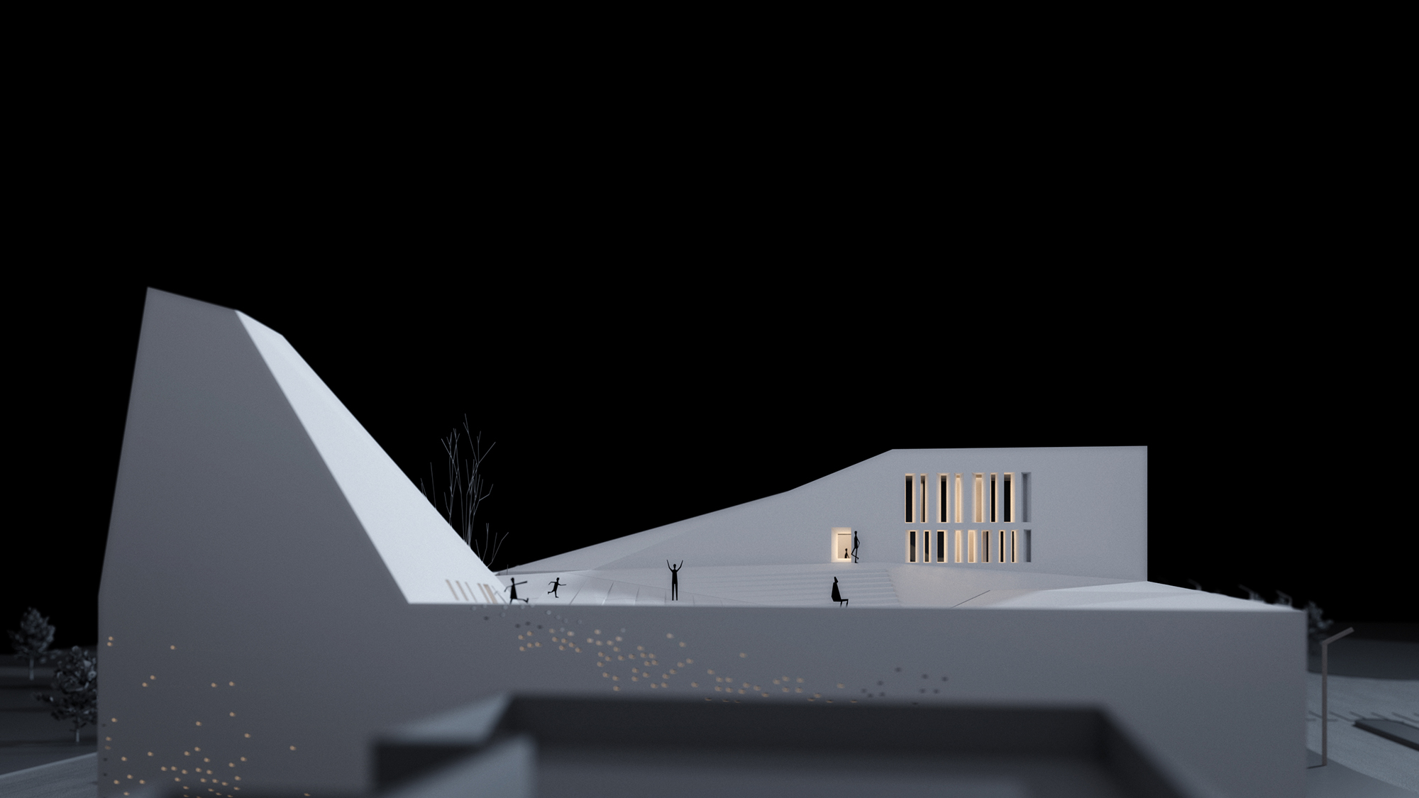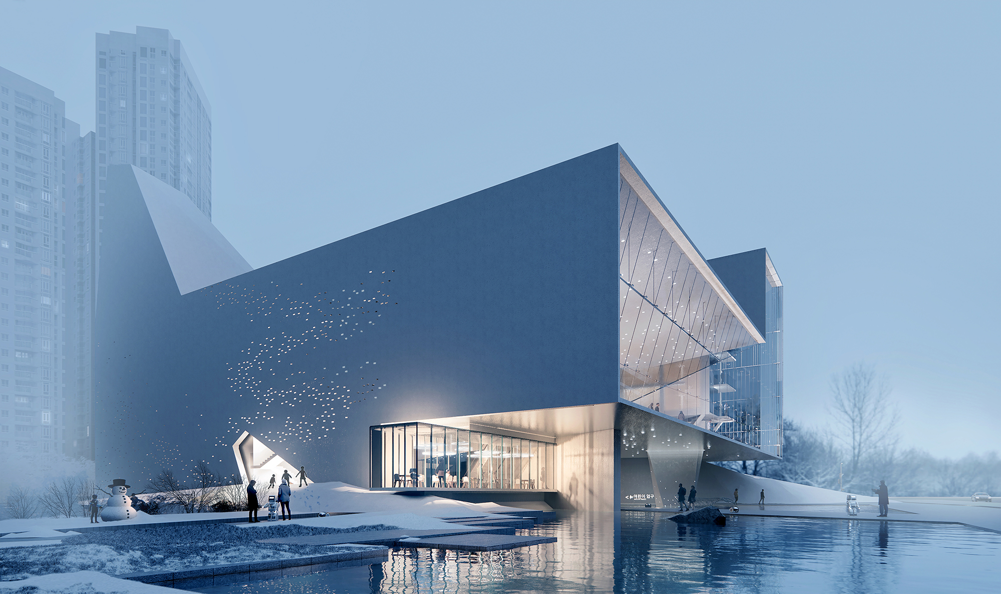 人类之所以能创造文明,创新的激情须如火山喷涌,思辨的理性则如冰峰沉思。设计中,“火山”拔地而起,创造室内富有精神性的攀升阅览体验;“冰峰”冷静规则,容纳开放阅览以外的研究静思功能。依据场地周边限定物属性,将相对封闭的“火山”置于西北一角,将功能集中的“冰峰”置于景观优良的东南侧。我们期待,不同视角下的凹凸跌宕能够成增添这座新城的趣味与意外。