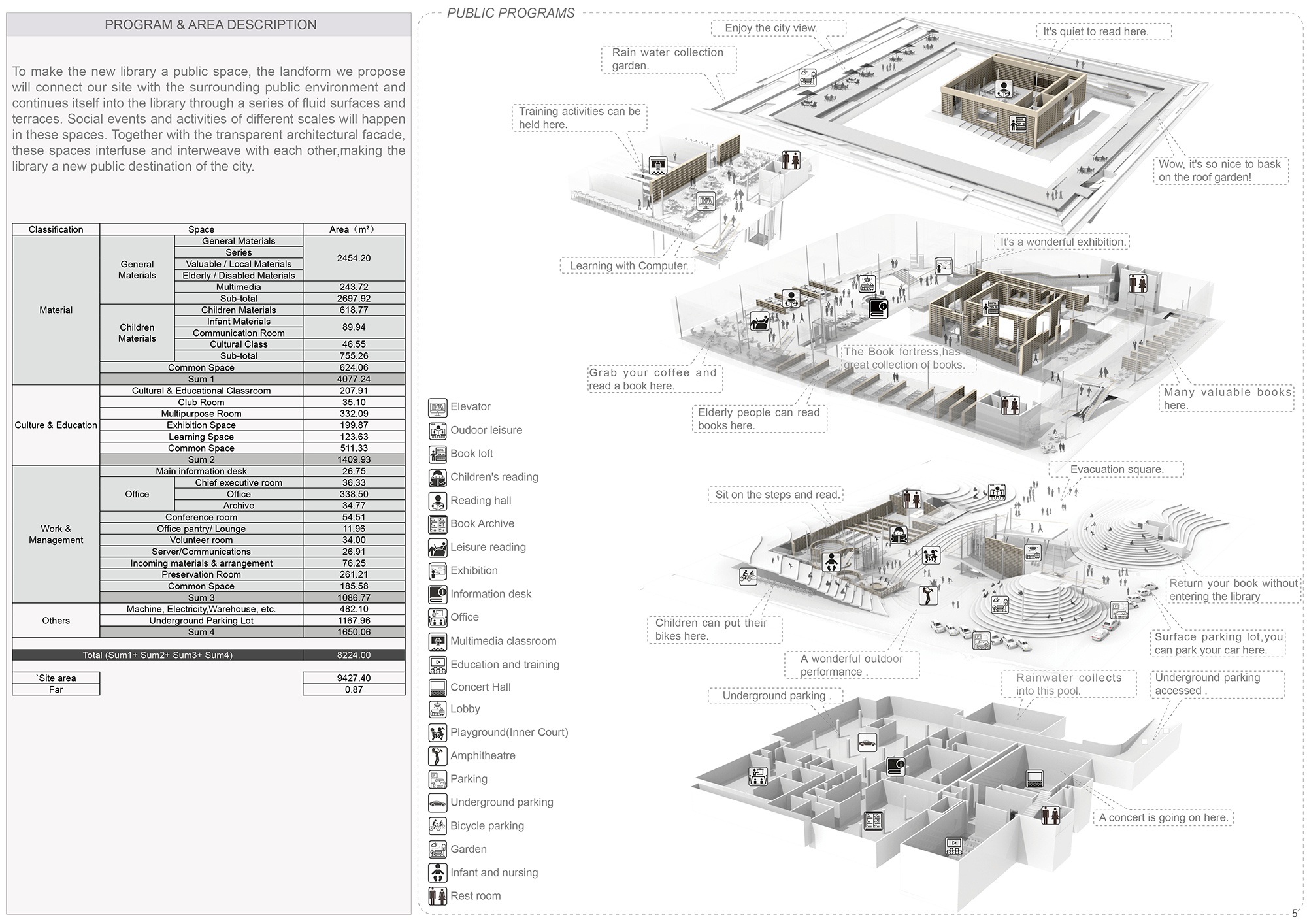 从中观的尺度,地貌系统形成了景观与建筑之间的无缝过渡。新图书馆的各种功能分别位于其上下方。从外围看,一个透明四合院包含的流动曲面作为室外地貌的延续,形成一个视觉延伸至外围环境的城市客厅。而在四合院里面,一个容纳多层书架的立方体通过长坡道与四合院相连接,使其像一个悬浮在透明大厅上的堡垒,进一步吸引游客前往探索。另一方面,音乐厅和教育教室布置在负一层,并通过庭院中的咖啡休息室与书籍堡垒连接。