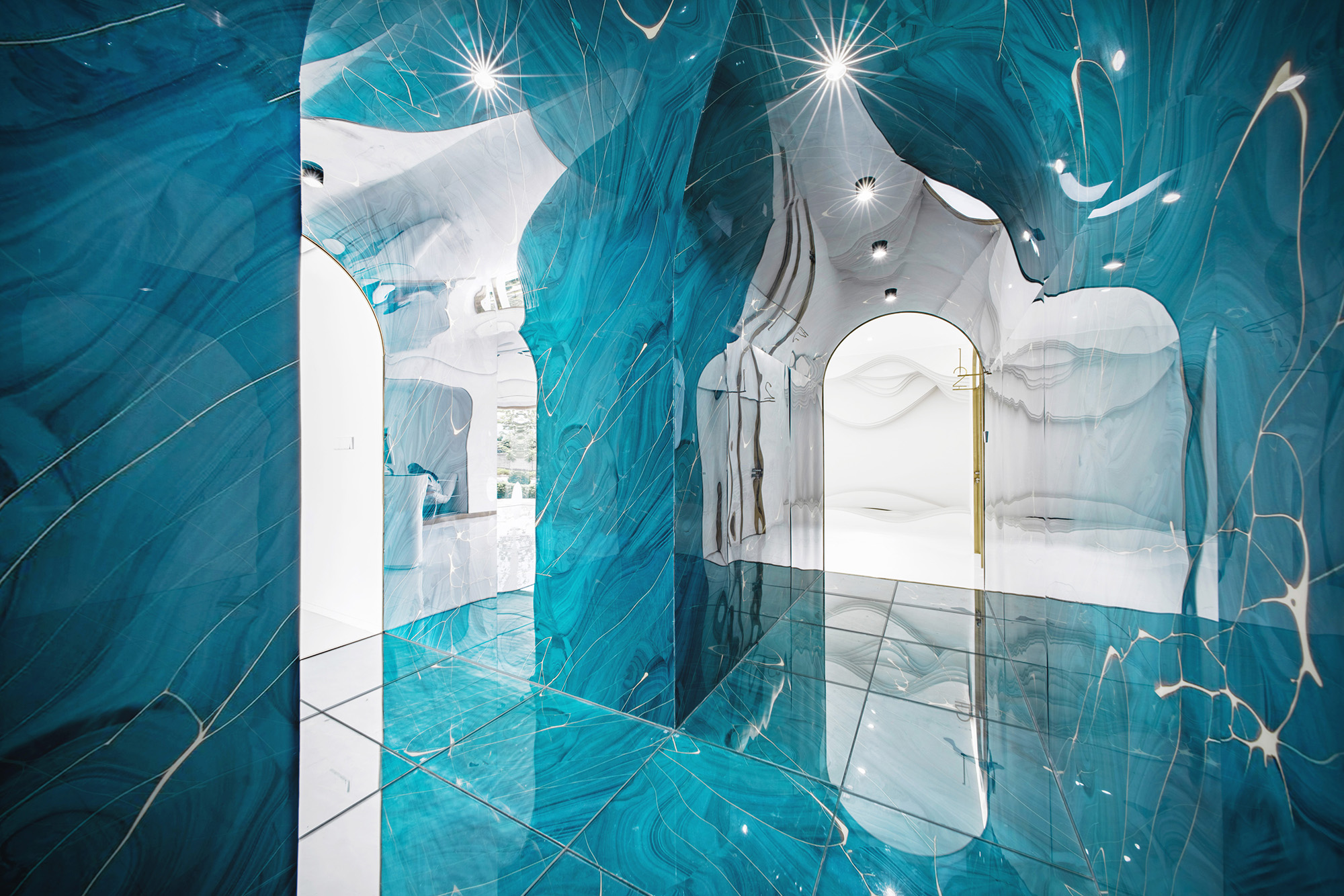空间选材上,整体运用白色木饰面、乳胶漆等作为空间基调,仿古铜拉丝不锈钢、水晶板、浅灰原木等作为点缀。“T”形通道则采用弧形拱顶,并在墙、顶、地三面上都统一使用蓝色的水晶亚克力板来打造“深水冰窟”的沉浸式体验,使得空间充满视觉张力。二者不论在色彩还是形式上都形成鲜明对比,从而突出强调了“秘境”通道的独特冲击力。