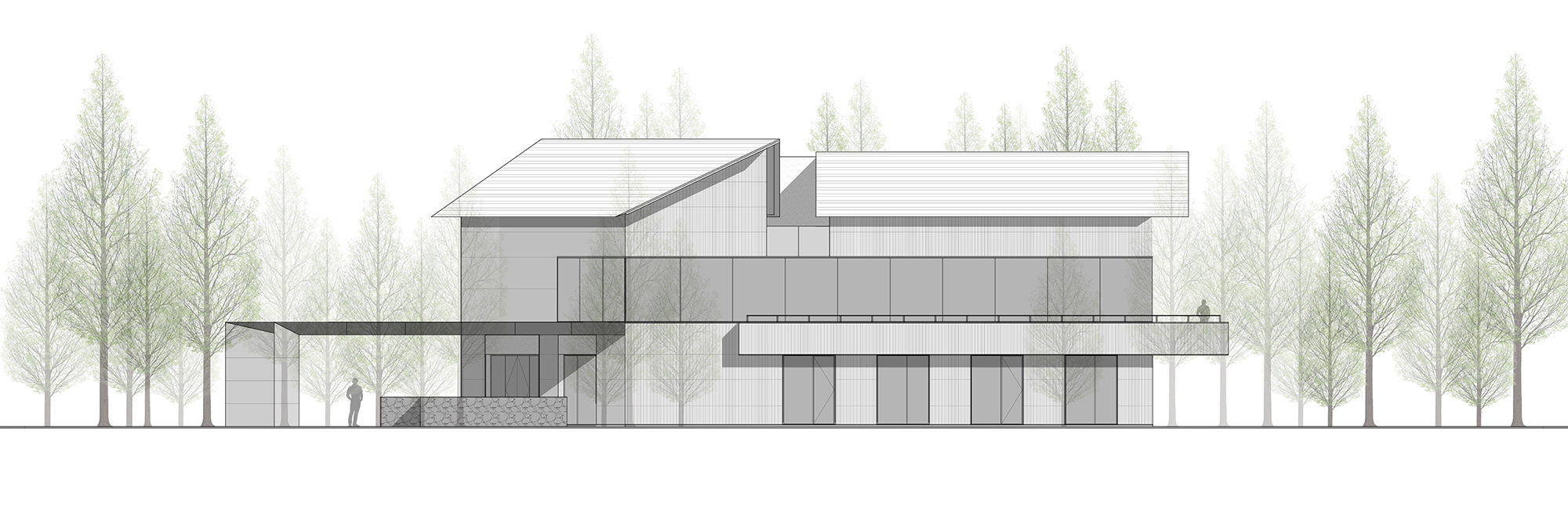沿着不规则的用地边界进行形体分解,先形成一个不规则的四边形基座,在敦实的基座上,三层体量上围绕迎向老山森林公园的大露台,切割成三个彼此分隔的坡屋面,削弱建筑整体体量感,以V字形的姿态拥抱自然。而入口处用三角形的大雨棚落客区向外侧延伸,使形体更为舒展。