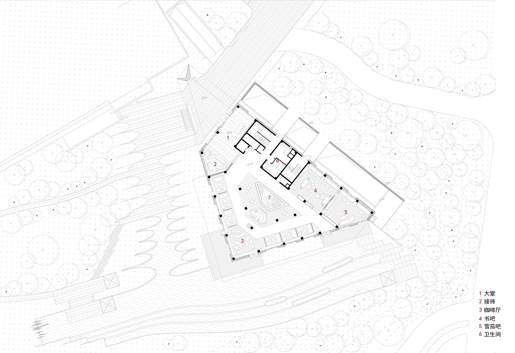 由于用地红线深入老山国家森林公园林场,用地红线犬牙交错,这里也形成了一小口袋,面对城市的袋口小,迎向森林的袋内乾坤大。项目总占地1830平方米,地下室是温泉泡池区,底层、二层是接待、私宴区,三层是独立SPA区,总计建筑面积2676平方米。