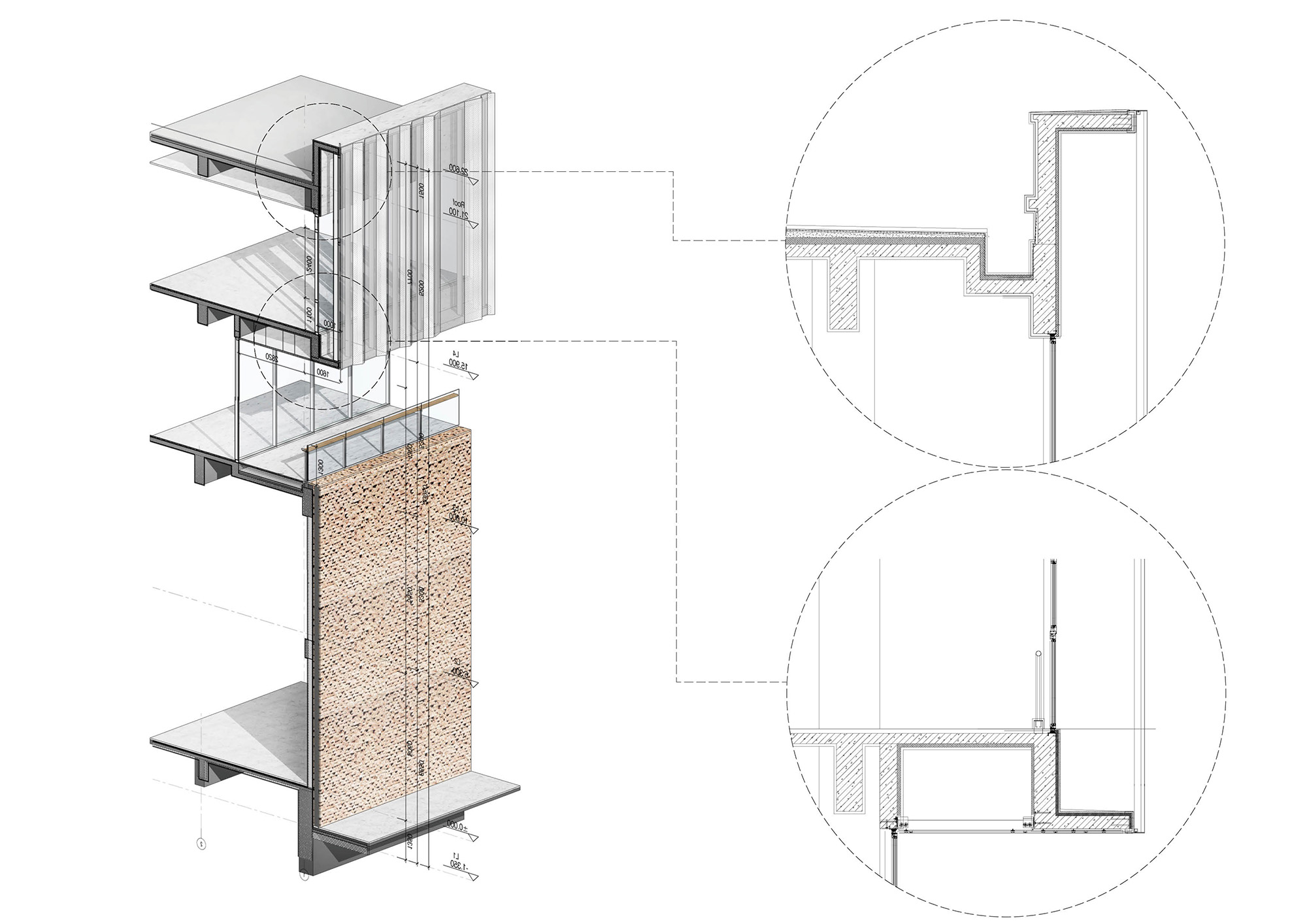 比如,在剧场外立面的处理上,采用页岩砖砌筑表面,意在用其粗糙的机理与具有时代感的颜色呼应热电厂的历史特质。整个四层的体量使用了双层立面,内表面为窗系统,可供室内开窗做自然通风,外表面为穿孔板,给建筑体量带来一种若隐若现的轻纱效果。