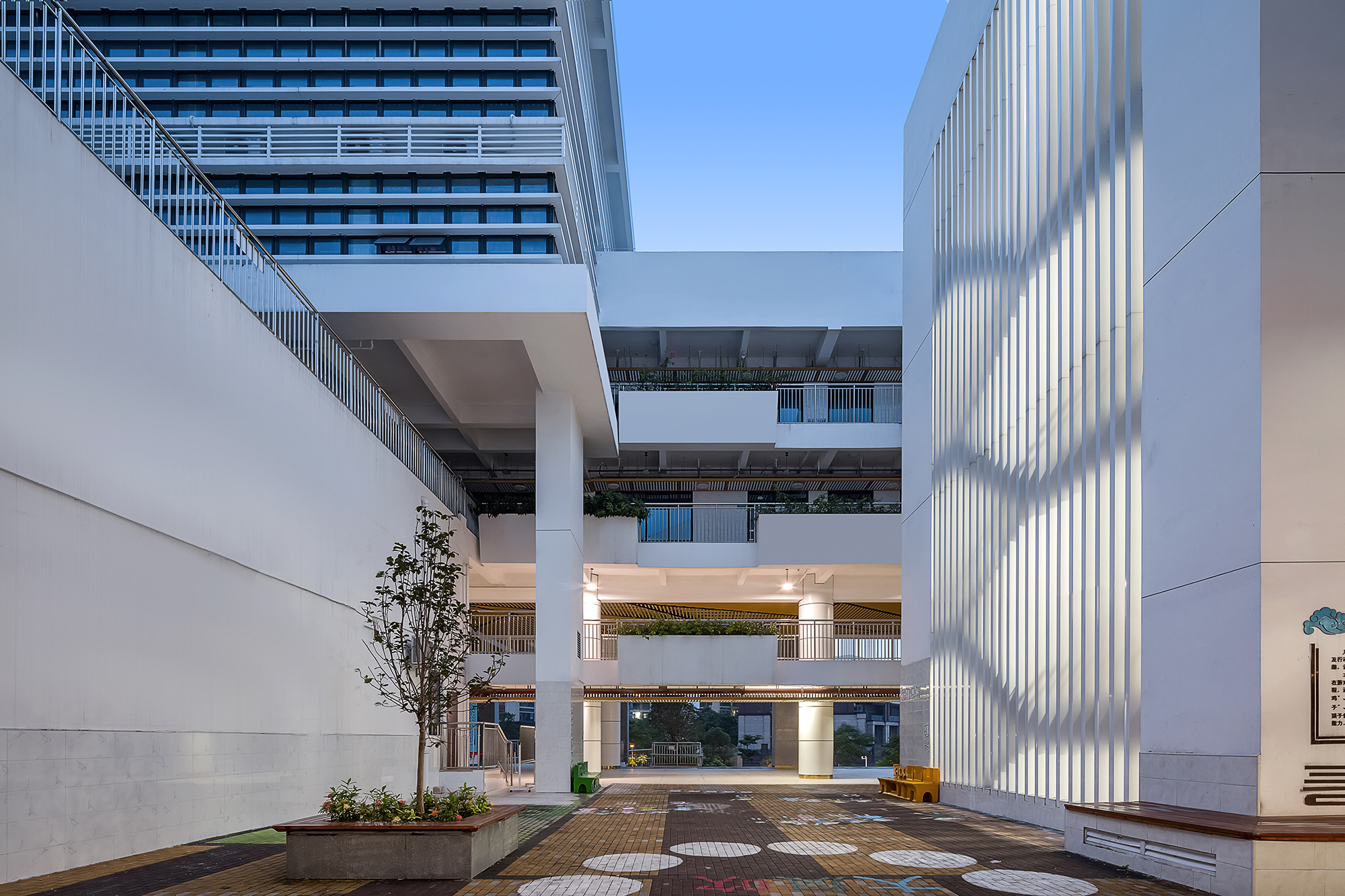 连廊底层向东西侧扩大为课间活动和休息场地,南北各有两处,中段是一个内向的观景花园,为师生提供安静私密的休闲空间。高楼层的学生可以利用连廊空间,凭栏远眺,放松身心。连廊虚实结合的立面打破了教学楼规整的节奏,再次强调了它的活力空间属性,它是孩子们活动交往、感受天光变化、洞察四季交替的重要场所。