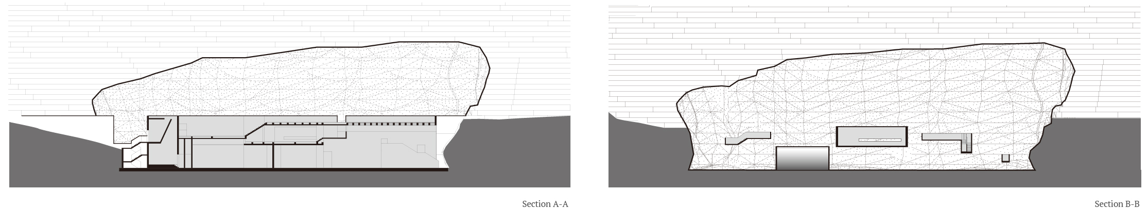 来访者从小田庄村出发,沿着一条两侧是山林,农田的乡村道路行进,绕过一个弯道就能看到项目外观及注意到半隐藏式的入口通道(准备),到达入口后穿过静暗且狭长的通道会看到前方的明亮的光及原场地保留的石壁边侧部分,它是属于半室内的空间也是入口前厅(前奏)。沿着台阶向上,台阶平台上连接着一个观景长桥,访客可以在此释放此前相对压抑的情绪,对石壁景观进行一次边侧角度的视觉接触。继续拾级而上经过圆弧楼梯后,到达了边侧平台,矿山石壁的整个形象变的更加清晰(序台)。紧接着再次进入室内,路程的第一个停顿点在于此,沿几步台阶而下是一个光线相对昏暗的冥想室,透过高度仅为600MM的开口部望向石壁而进行哲思(停顿)。接下来到达斜坡平台,呈现在眼前的是与石壁景观截然相反的自然景观(转换)。接着向前到达半封闭的室内平台,沿级向上的台阶将访客引导到可以观览整个区域两侧二元对立景观的观景平台,至旅程中段访客对这两种元素的压抑和不解,到达观景平台后对二者重新解译,形成一套自我反馈的情景叙事(高层呈现)。继续沿着一段直线台阶,L型台阶, U型台阶漫长路途而下(过渡),呈现的是此前旅途下意识体验到的石壁,光与湖水的水平全面情景(底层呈现)。通过边侧入口进入室内,两旁被当地常用石砖墙包围,由天花板和出入口渗透进室内的光使访客在线性空间内伴随着时间向前行进(升华)。转过一面墙后,通高天花板两侧的光及狭长的走廊,令访客感受终点体验于此开始(结束前奏)。回到半隐藏通道后人们加快步伐向对面的出口走去,直到农田地平线出现在面前,将我们送回至乡间的农业景观中,光线与噪声才渐渐变得密集起来(回归)。