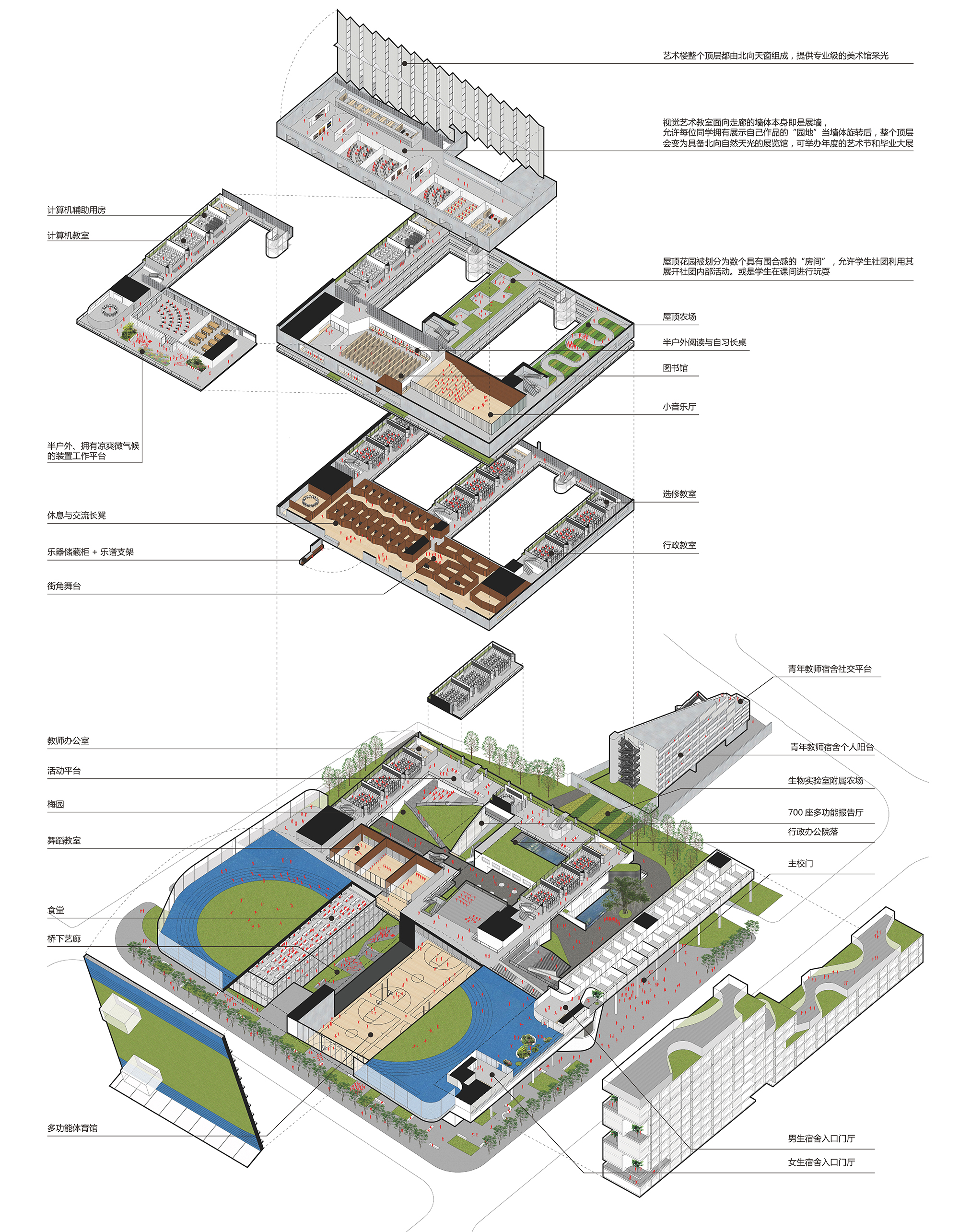 有鉴于此,我们在传统的全寄宿制校园的“学习空间”与“生活空间”两元之外,植入了作为第三类的“即兴空间”。有别于限时开放的“机构空间”(例如教室和宿舍),全天候运行的即兴空间存在于校园的“孔隙”之中,以多样化的尺度和设施,满足不同类型的活动需求:允许进行在地艺术品制作的半户外工作平台;拥有顶层自然采光、可挂装和展示艺术品的“画廊”;允许大尺寸装置建造和涂鸦创作的“桥下艺廊”;装配练习镜和木地板的舞蹈热身空间;提供了适宜围合感、可供社团活动的天台花园,等。
