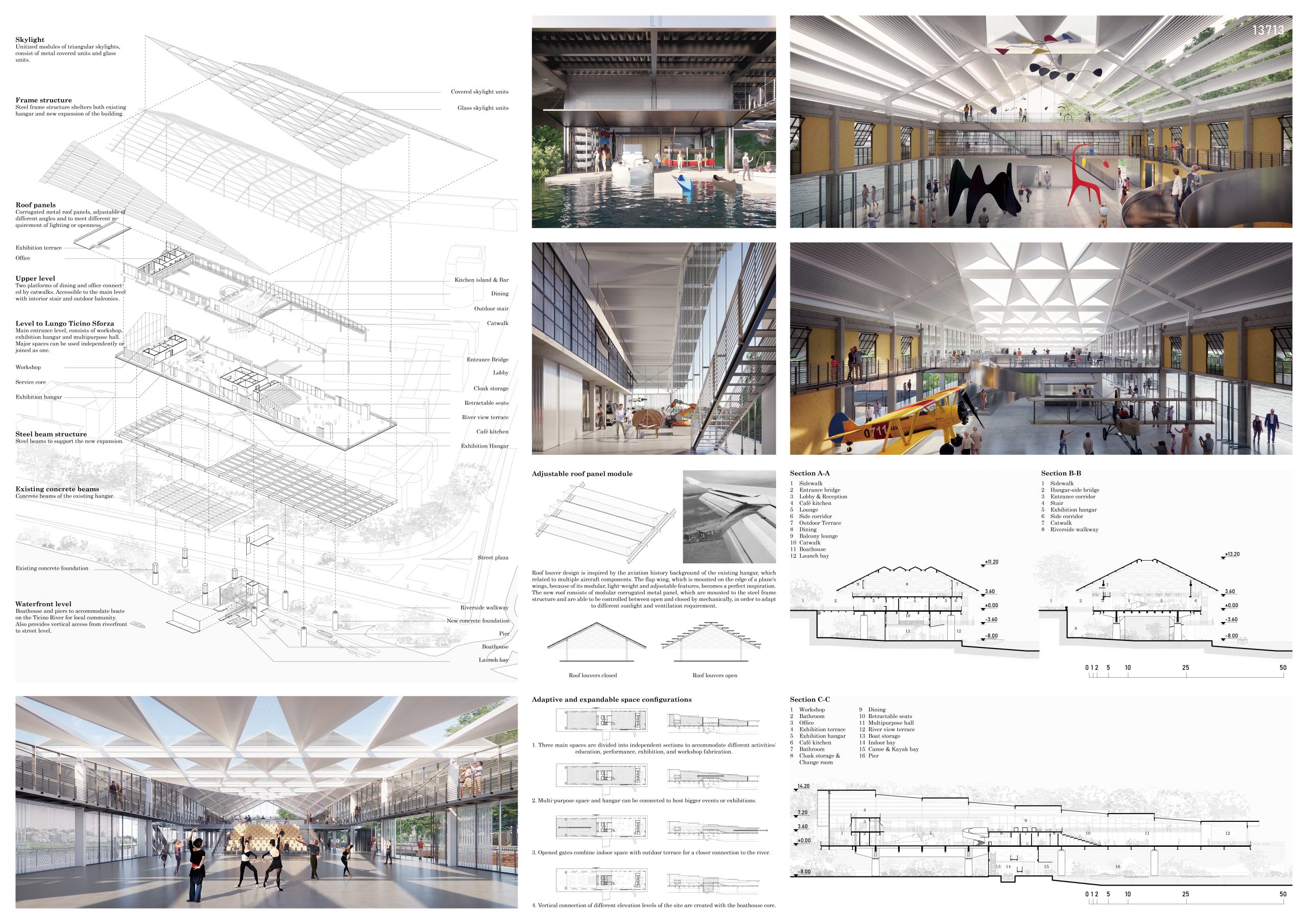 The essence of the project is double, and so is its architecture. To accommodate the activities, Twofold proposes two structures. The first is the reconstructed Hangar, with an intervention that restores Pagano’s initial logic and respects its structure, envelope, and roof. The second is its inversion, a floating shed traveling along Ticino, that energizes the river’s borders and unveils a new perspective of the city from inside the water.