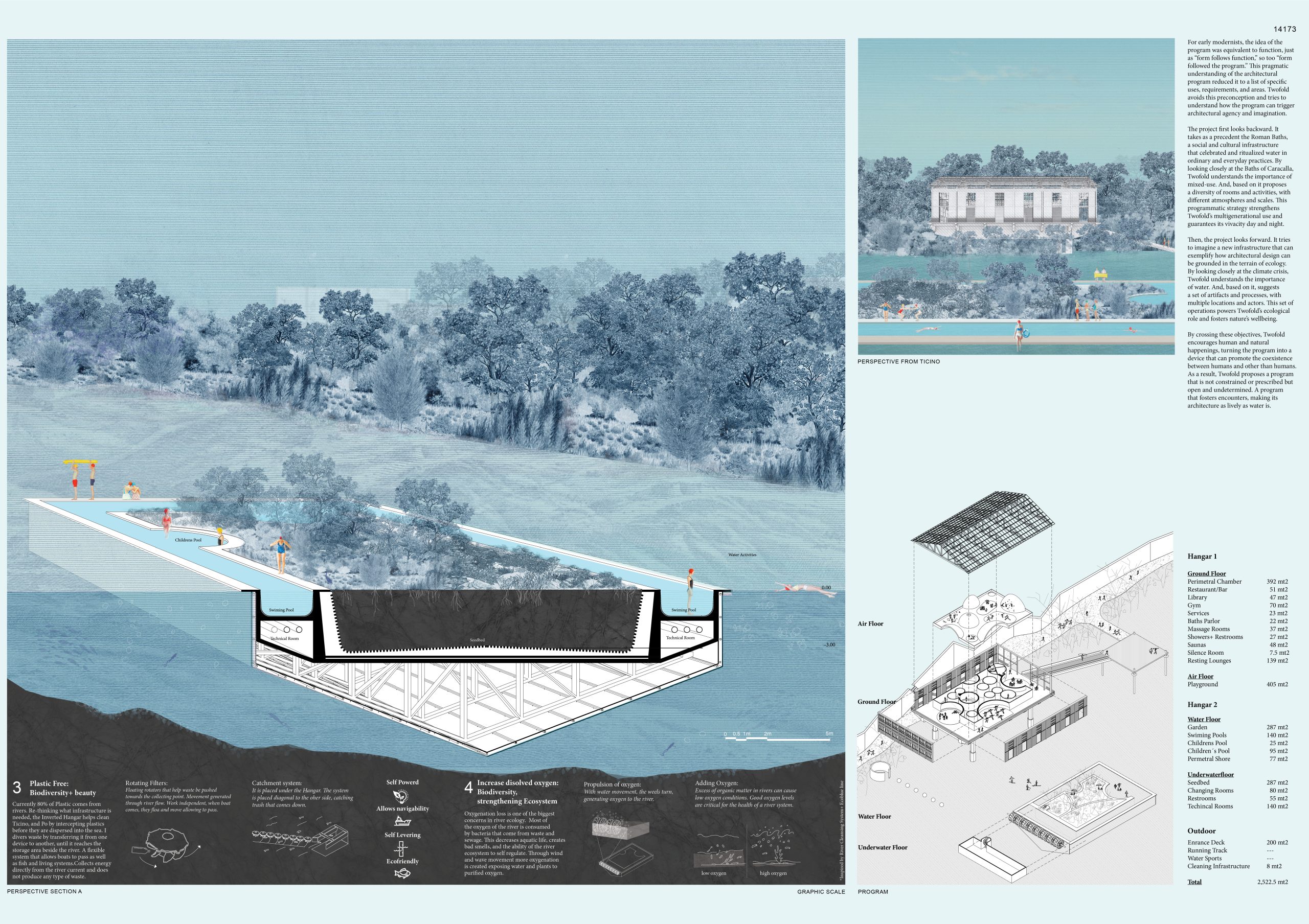 When conceived, Hangar Ticinum was part of Pavia’s infrastructure to support its growth and prosperity. This lifted structure, disconnected from its landscape, embodied the principles of modernity, glorifying and sheltering man and his technologies. Twofold honors the initial project’s infrastructural origin. However, it redefines its scope by sheltering multiple forms of life and honoring water as the fundamental foundation.
