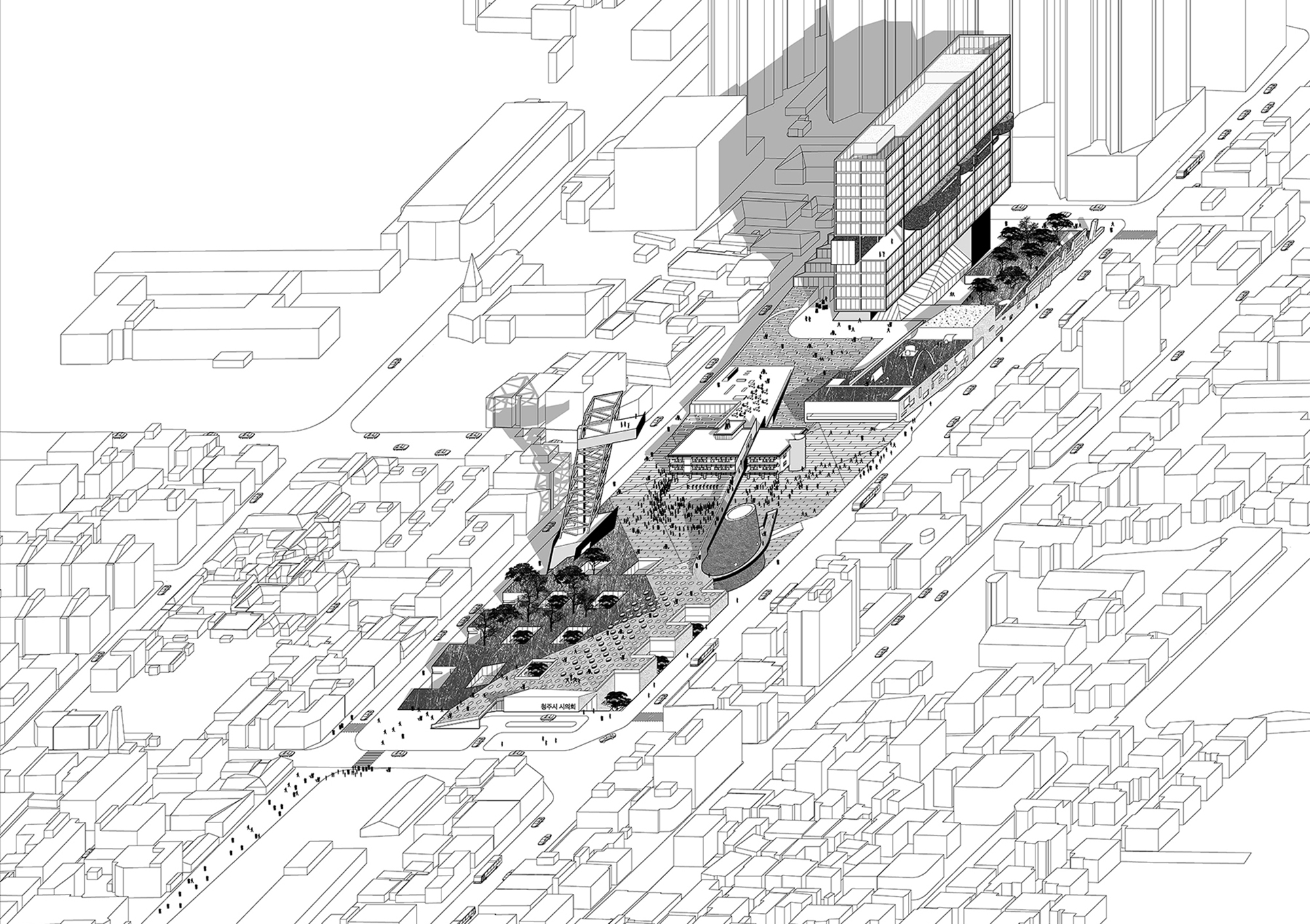 然而在二十多年后,是否‘毕尔巴鄂效应’还能够使一座城市变得更好?毕竟,清州本身的美来自这样一个事实:这是一座大众的城市。它均质化的外表下是多元的内核。‘日常的平庸’恰恰是最应被保存下来的品质。清州的市民们就是这座城市的象征。有鉴于此,新的市政厅将是一处“生产”象征的空间,而非让自己成为“象征”。它将是这座拥挤城市的“留白”,拥有可以聚拢所有人的尺度。它是一处场所,而非一个物体。它既庄严又随和。它渴望被以最为有创造力但又不合时宜的方法所占据。它激发灵感和行动。这是一个由千万颗跳动心脏构成的新城市核心。